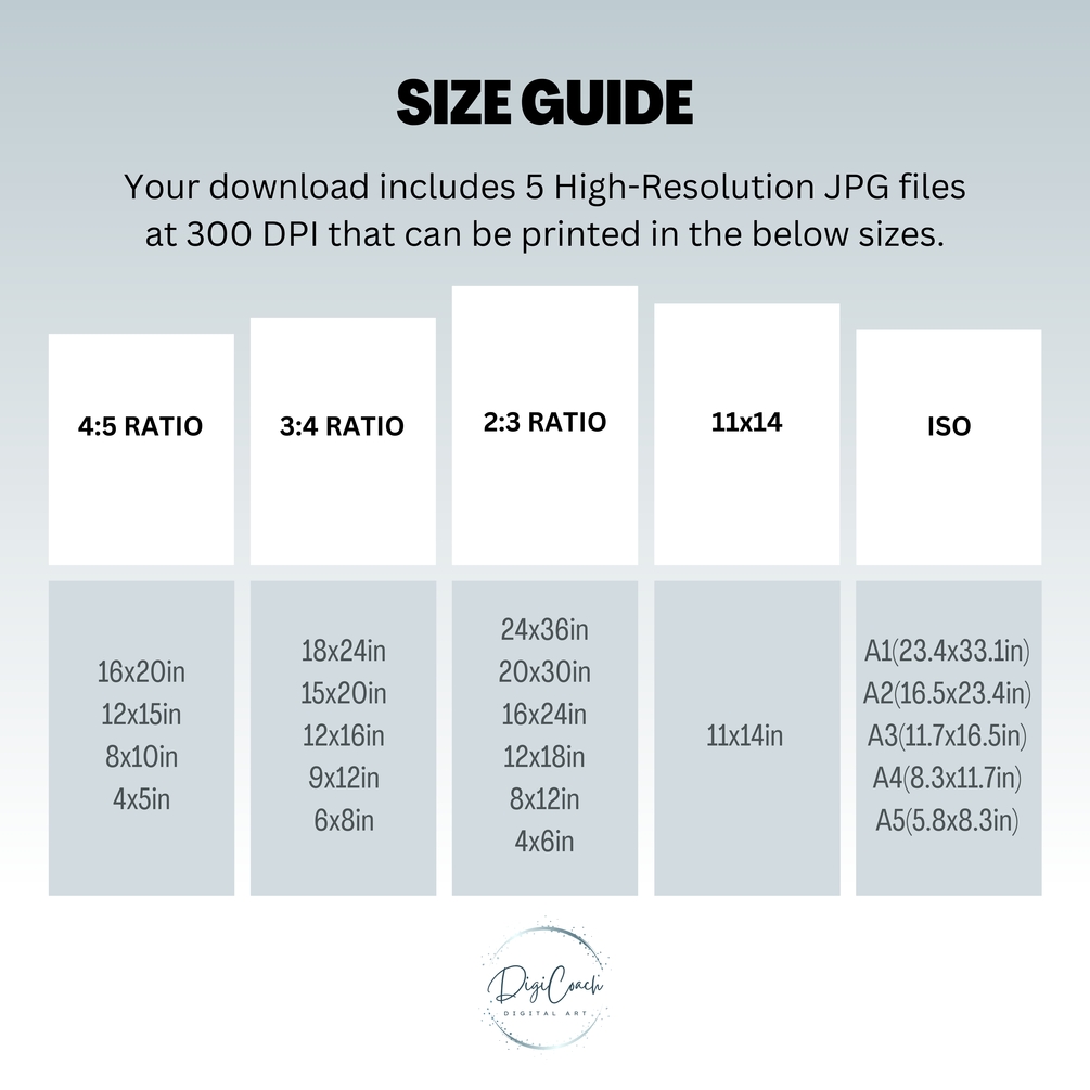 Your purchase includes five high-resolution 300dpi JPG files, with different ratio options that prints in many sizes, for each design.